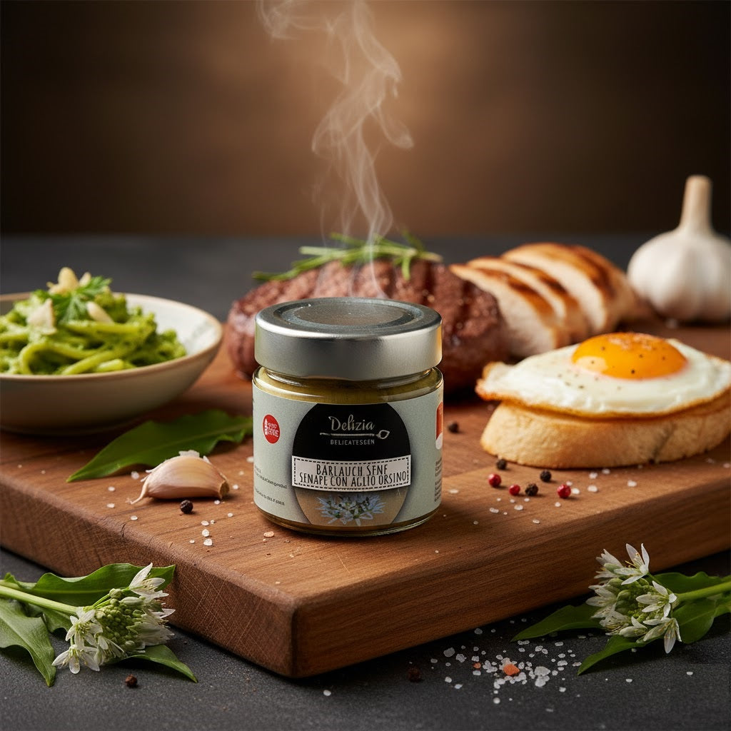 Gustosa e raffinata senape dal sapore persistente dell'aglio selvatico, è ideale come condimento per carni rosse e bianche, pasta, e piatti a base di uova